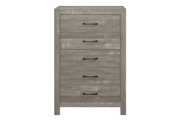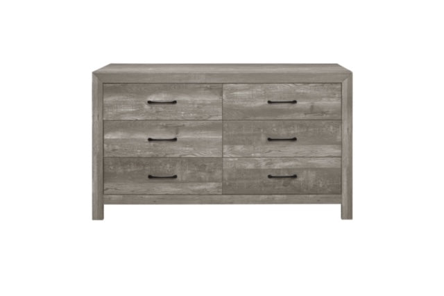 Les lignes modernes et le style rustique sont jumelés pour créer le look de la collection Corbin. La texture du placage de papier imprimé en 3D est mise en évidence par une finition grise pour un look de bois réaliste. Offrant un contraste complémentaire, les devants du tiroir de la commode, de la poitrine et de la table de chevet sont dotés d’un matériel en métal noir. Un cadrage subtil définit le profil de la tête de lit et du pied de lit, ce qui ajoute à la conception sans entrave de la collection.