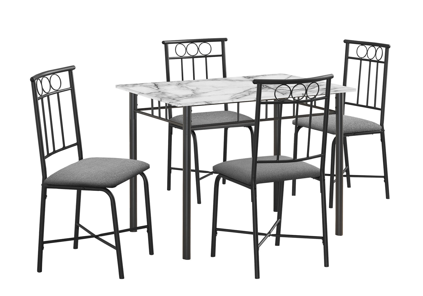 - Profitez d'un repas familial décontracté avec cet ensemble de salle à manger 5 pièces comprenant une table rectangulaire de 40 pouces avec un plateau en stratifié aspect marbre blanc à la mode et des pieds en métal noir, dans un décor contemporain.