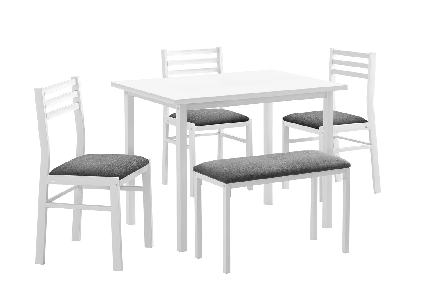 - La construction en métal blanc de ce jeu de salle à manger est solide et robuste, tandis que les chaises et le banc qui sont confortablement rembourrés et recouverts d'un mélange durable de lin et de coton gris.