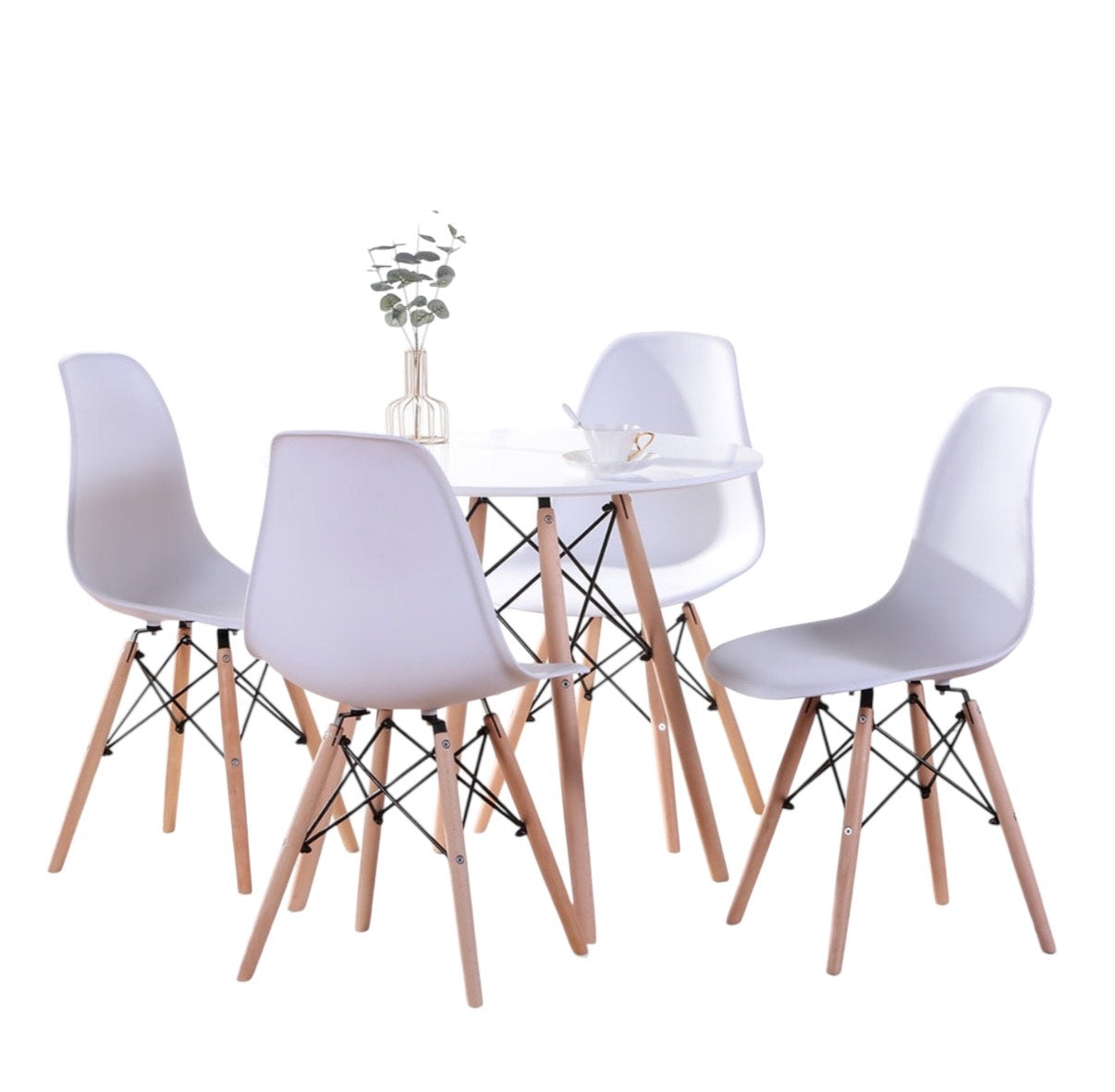 Découvrez l'ensemble de cuisine Milan, composé de cinq pièces alliant design et robustesse. La table ronde laquée repose sur des pieds en bois de hêtre massif renforcés par une structure métallique, assurant stabilité et durabilité. Les chaises Eiffel, avec leur assise moulée en polypropylène blanc, offrent un confort optimal tout en apportant une touche contemporaine à votre espace. Ce mobilier allie élégance et fonctionnalité pour sublimer votre salle à manger.
