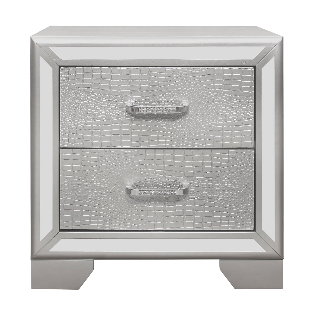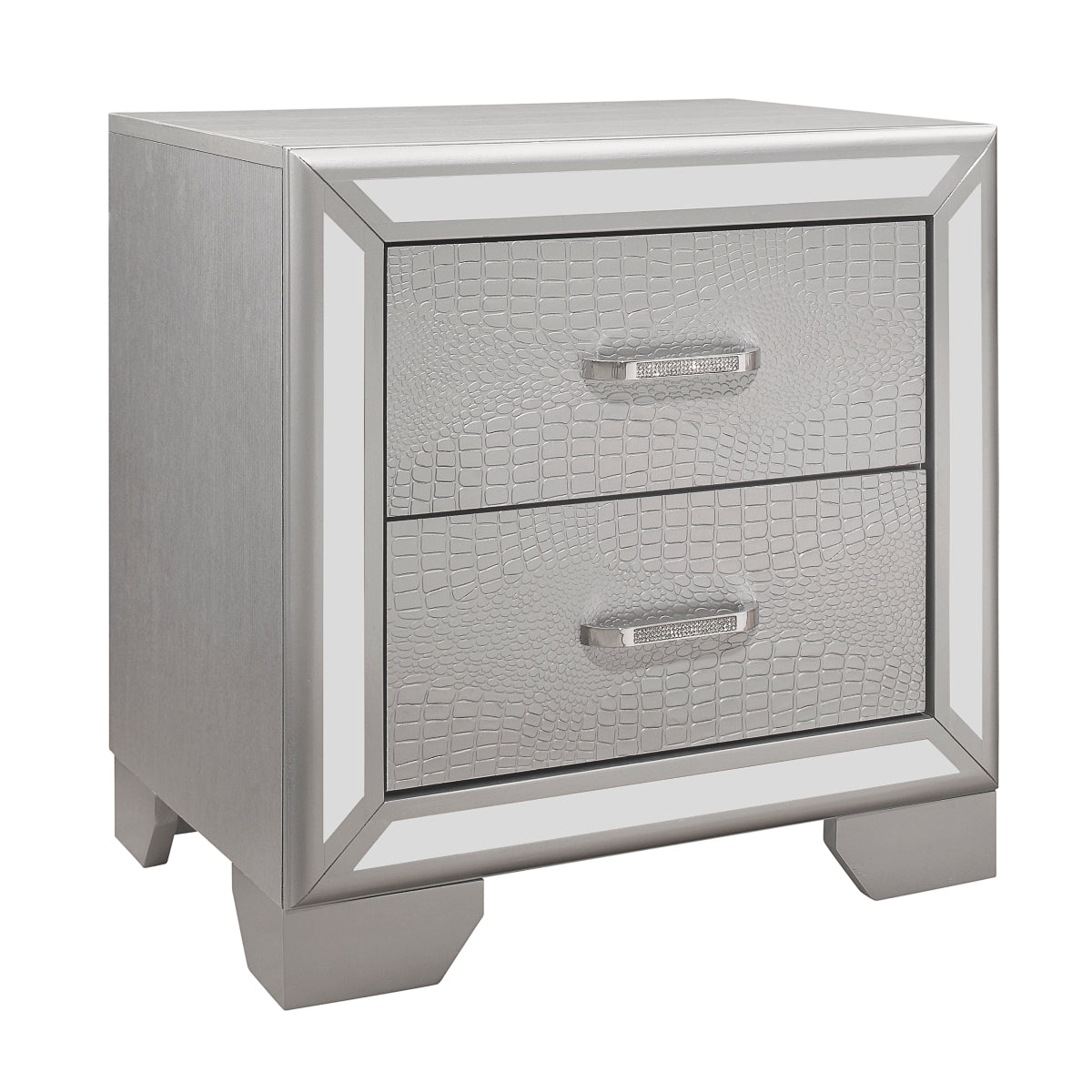 Cette élégante table de nuit de la collection Aveline apporte une touche de glamour à votre chambre à coucher. Revêtue d’un placage gaufré imitation alligator et finie en argent, elle s’intègre parfaitement à tout décor sophistiqué. Le cadre est accentué de bordures miroir et les tiroirs sont équipés de poignées en fausse incrustation de cristal chromé, ajoutant une touche décorative raffinée à cette pièce de mobilier.